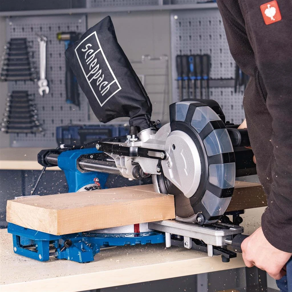 - La scie à onglet bien équipée Scheppach HM 216 SPX est une excellente aide à la maison, dans l’atelier ou sur le chantier.